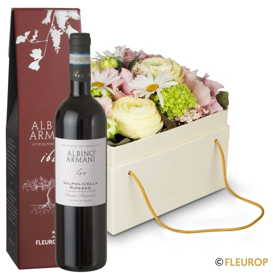 Ce message floral est associé à une excellente bouteille de Valpolicella Ripasso Classico Superiore DOC (75 cl) d’Albino Armani, dans un emballage cadeau élégant.