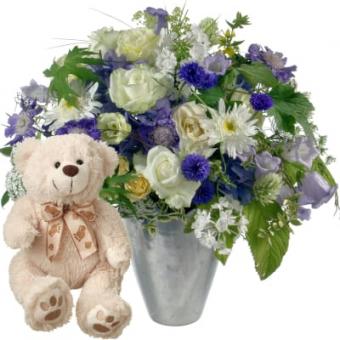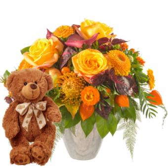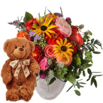 Bouquet de fleurs joyeux avec ours en peluche (brun)
