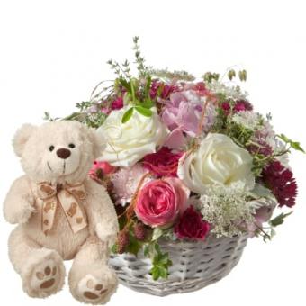 Doux panier fleuri avec ours en peluche (blanc)
