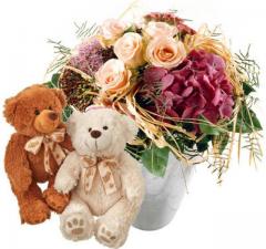 Bouquet d’été romantique avec couple d’ours en peluche (blanc & brun)